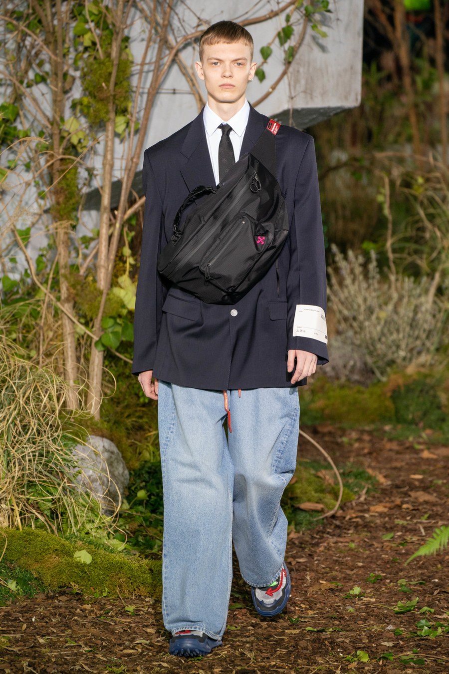 既然西裤能搭配运动鞋,那是不是也要给西装外套增添一点街头感?OFF-WHITE本季带来了一些搭配西服外套的男士阔腿裤。除了将普通西裤的裁剪进行修改,OFF-WHITE的设计师Virgil Abloh也进行了突破“次元”的尝试,即西服外套搭配阔腿牛仔裤。不过,这种完全显示不出来身材的搭配方法,对于一般身材的男士来说还是谨慎尝试。