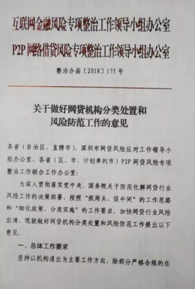 1月21日,业内流传一份疑似监管文件,文件内容主要是对网贷机构的分类处置和风险防范工作做部署。基金君核实后获悉,互联网金融风险专项整治工作领导小组办公室、P2P网贷风险专项整治工作领导小组办公室确实在去年12月19日联合下发了《关于做好网贷机构分类处置和风险防范工作的意见》(以下简称“175号文”)。总体工作要求是,坚持以机构退出为主要工作方向,除部分严格合规的在营机构外,其余机构能退尽退,应关尽关,加大整治工作的力度和速度。监管整肃网贷的决心可见一斑。