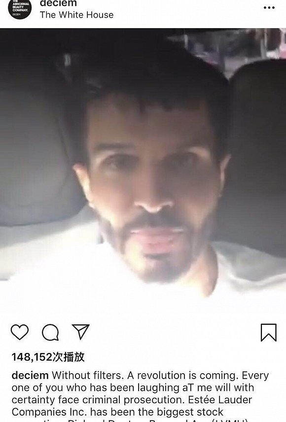他还在视频中表示,Deciem的所有人都被卷入了包括金融犯罪在内的大型犯罪活动,并点名了包括雅诗兰黛、LVMH、H&M,甚至Tim Cook和特朗普等众多大型公司、名人,称他们都与此事脱离不了关系。“一场革命马上就要来了。”他在帖子中写道。