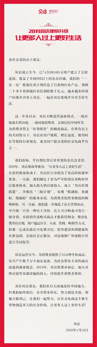 贝店近日发布2019用户公开信,宣布贝店使命升级为“让更多人过上更好生活”,同时透露在新使命的驱动下,贝店将加大对源头供应链的投入,明确店主的自购与一级分销行为,同时倡导建设良好的社群氛围,加强对宣传推广的监管。
