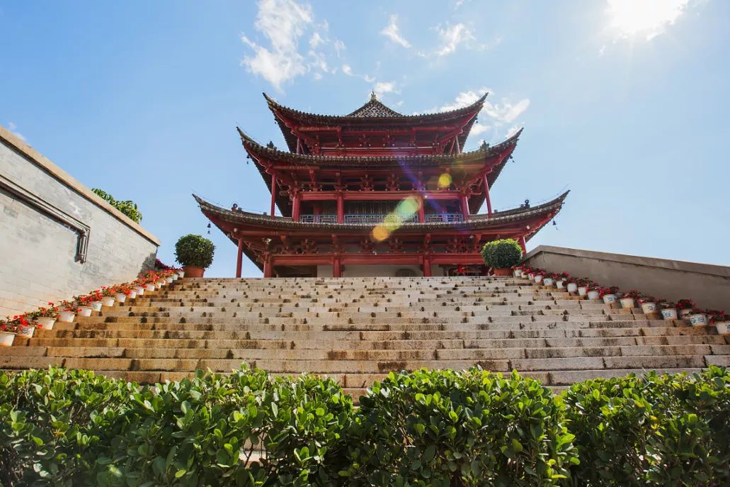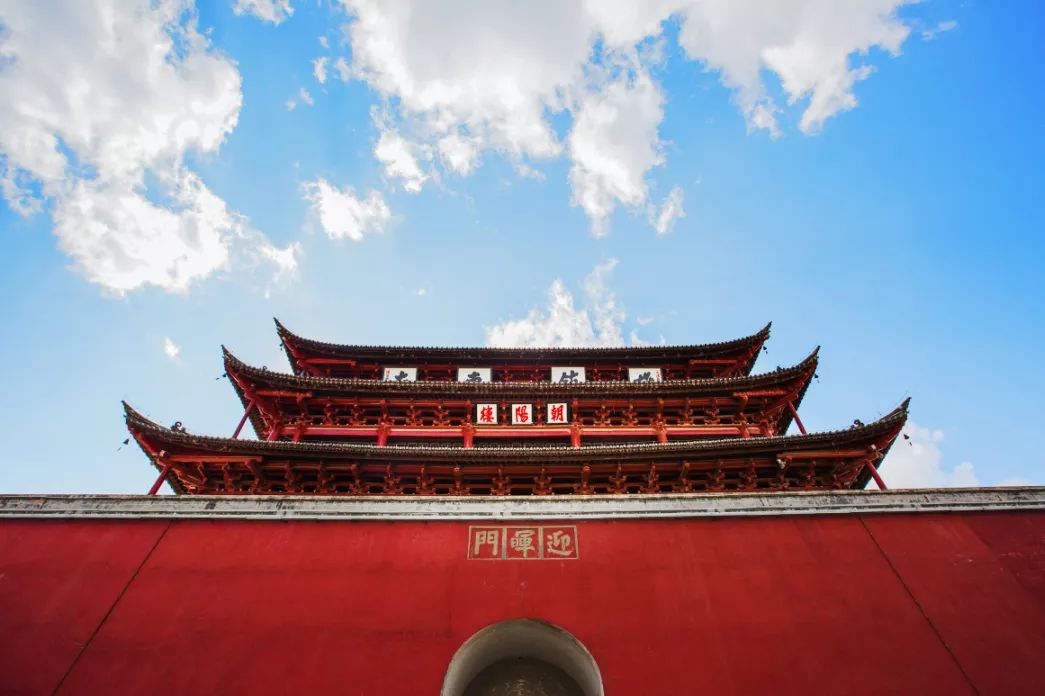 原来是明代建水城的东城门楼,同样红色的城墙,同样的檐角飞翘,巍峨挺拔,外观上和天安门非常相似,而且建造的年代还要早28年。(朝阳楼建于1389年,天安门建于1417年)