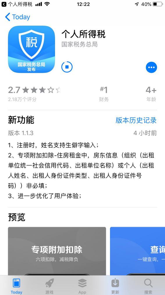 2019年1月21日,IOS端的“个人所得税”APP进行了一次更新,除了对生僻字输入及用户体验进行优化,还将专项附加扣除-住房租金一项中的房东信息改为了非必填选项,这意味着用户目前只需要填写房屋地址、租赁时间及租赁合同编号即可进行住房租金抵扣个税的操作。