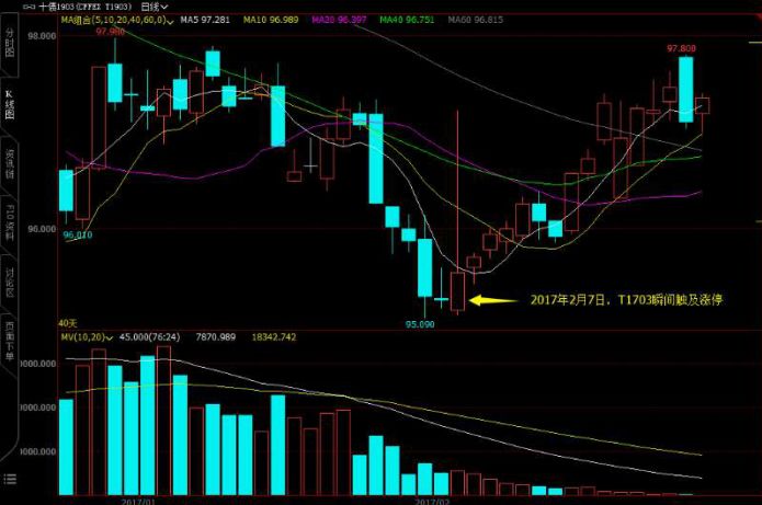 2017年2月7日,早盘9点19分T1703合约成交价格突然打至涨停价97.23元。触及2%涨停板,而10年期国债期货T1706和T1709合约基本平稳,无大的异动。可见该笔操作大概率是失误造成的,即所谓的乌龙指。按此价格,该笔损失大约是每手2万元,共计121手,因此,此笔交易损失大约240万左右。