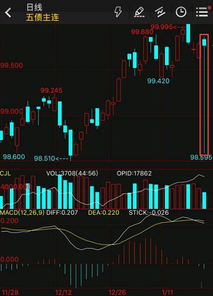 1月23日早盘,五年期国债期货出现“闪崩”。从分时图上看,原本开盘后的主力合约TF1903价格保持在99.8左右,但开盘不久就出现直线跳水,最低触及98.595元,跌幅逼近1.2%跌停板位置。