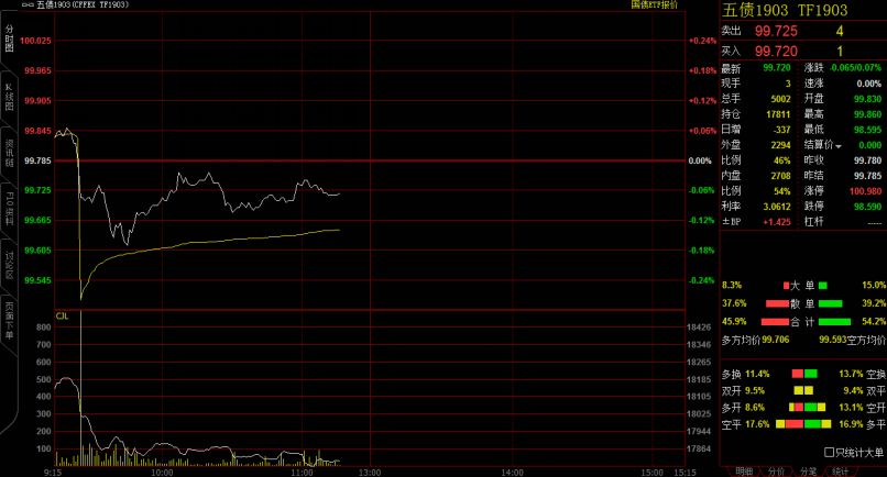从分笔成交明细可以看到,上午9点25分09秒,一笔240手的多头平仓交易,将TF1903合约价格直接打到98.595元,之后期价迅速回升。