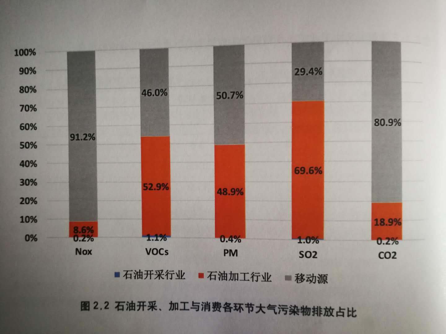 《报告》称,利用空气质置模型,模拟石油相关行业大气污染物排放对PM2.5年均浓度的影响,结果表明,石油开采、加工与消费过程排放的氮氧化物、二氧化硫、颗粒物、挥发性有机物等大气污染物,对2015年PM2.5年均浓度的贡献为10.9%。其中,移动源贡献为9.8%,石化行业贡献为1.1%。