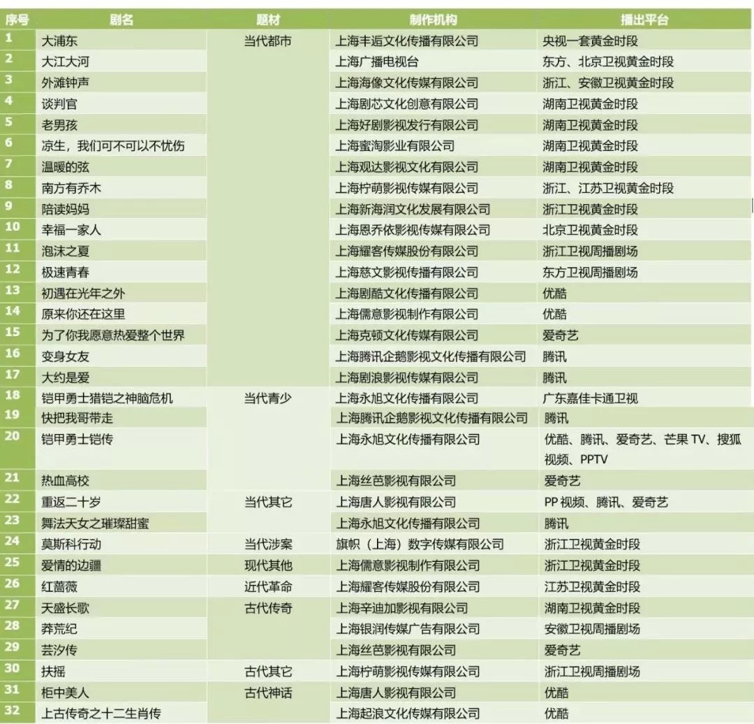 制作公司方面,除SMG(上海广播电视台)外,上海柠萌影视传媒有限公司、上海克顿文化传媒有限公司、上海腾讯企鹅影视文化传播有限公司、上海辛迪加影视有限公司、上海耀客传媒股份有限公司等表明突出。整体上看,大公司旗下子公司则频频出击,克顿传媒具有组团优势,华策影视与腾讯资本占据首轮播出沪产剧的半壁江山。