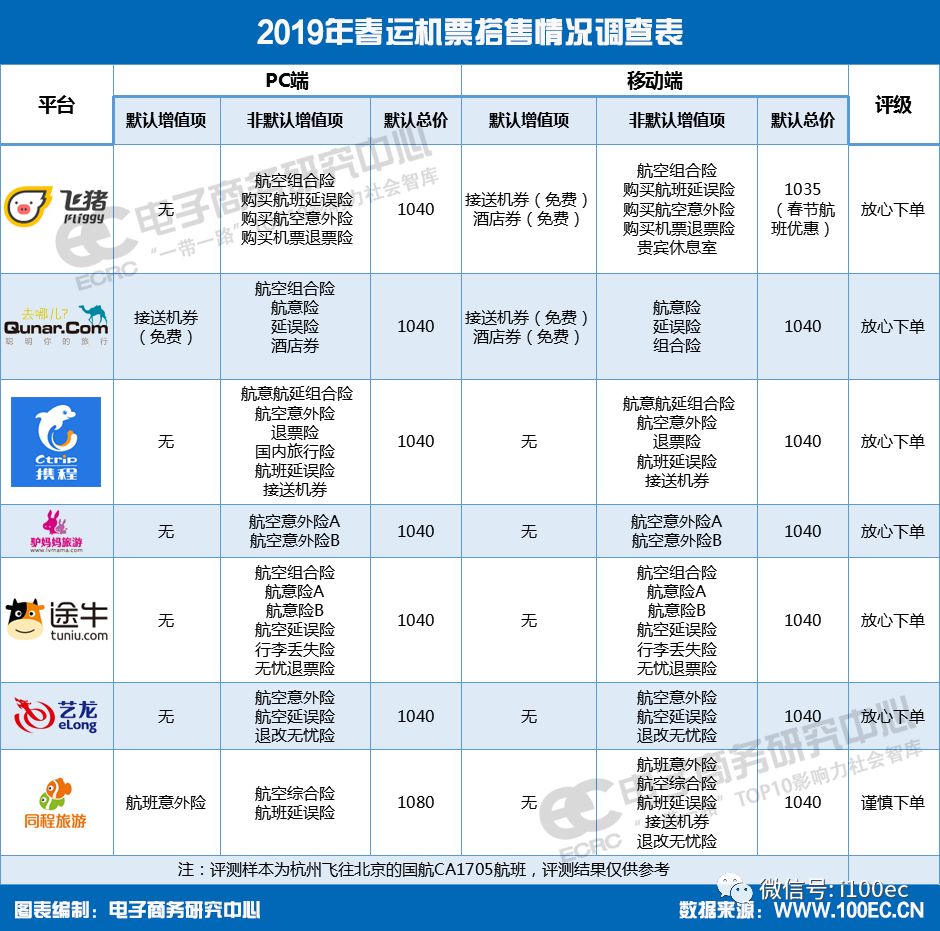 在此背景下,电子商务研究中心(微信ID:i100ec)对包括携程、飞猪、途牛、去哪儿、同程旅游、驴妈妈旅游、艺龙等主流在线旅游平台(OTA),开展春运机票购票独立评测,并给出相应评级。此前,我们还对各OTA做过火车票评测(【评测】春运火车票哪家OTA值得买?飞猪等获“放心下单”评级)。