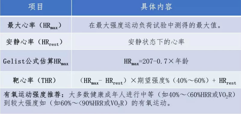 一般来说,运动强度可以根据最大摄氧量的百分比、代谢当量、心率、自觉疲劳程度和无氧域等指标来确定。鉴于普通健康个体实操性,这里介绍使用心率和自觉疲劳程度来确定运动强度,这与直接测量法等会存在一定误差,需要注意。