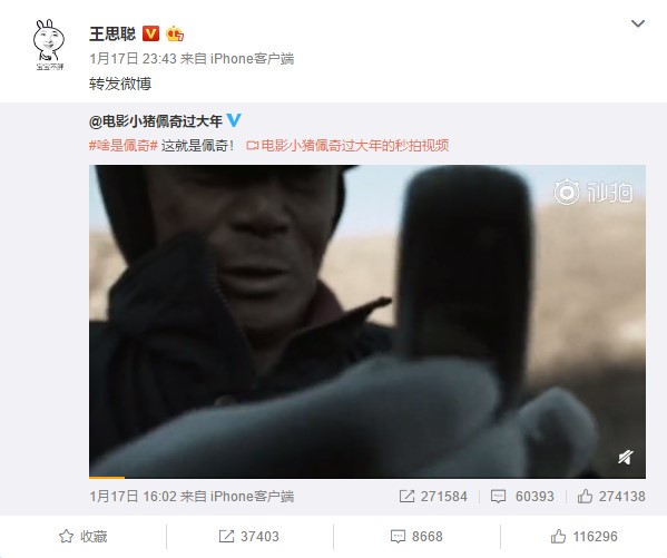 几天前,一夜之间“啥是佩奇?”刷爆整个网络。一部名为《啥是佩奇》的不足6分钟的短片,在各大社交平台上引发了病毒式传播,为春节档电影《小猪佩奇过大年》造足了声势。截止18号下午,这条宣传片原视频在电影官方微博账号上的转发量达到19.9万,评论数4.7万,播放量超过了2982万次。之后,片方还发布了时长为8分钟的“导演剪辑版”,在腾讯视频平台上,淘票票发布的“导演版”播放量也超过了30万。