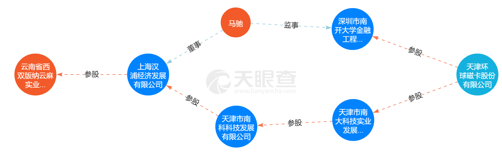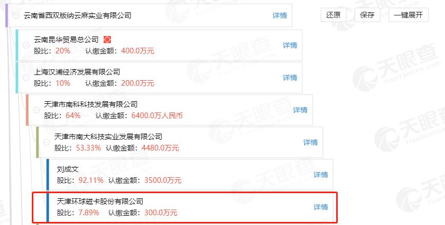 此外,天津磁卡(600800.SH)亦在1月24日涨停。天眼查信息显示,穿透之后,天津磁卡在股权上与工业大麻种植企业云南省西双版纳云麻实业有限公司(下称云麻实业)存在一定关联。值得一提的是,由于层层穿透,天津磁卡在云麻实业的间接持股比例极低。