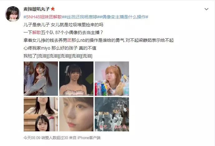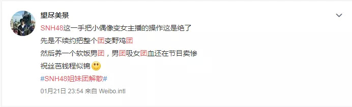 女团粉们愤懑不平,近几天来,粉丝们反复在各个社交平台发出控诉。曾经他们在剧场里感受到的沉浸、在握手会10秒相处中产生的共情、总选上不遗余力的氪金支持,都化为了他们与小偶像之间不囿于粉丝与偶像这层关系的“羁绊”。这场控诉,最终都指向了一个地方。
