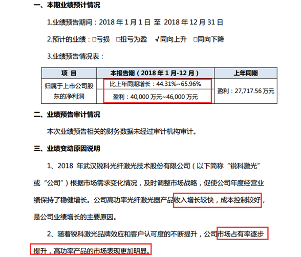 1月21日,上市仅半年的光纤激光器龙头锐科激光发布了2018年业绩预告:全年净利润4.0-4.6亿,同比增长44%-66%。其中非经常性损益对净利润的影响金额约3200万,去年同期为560万。