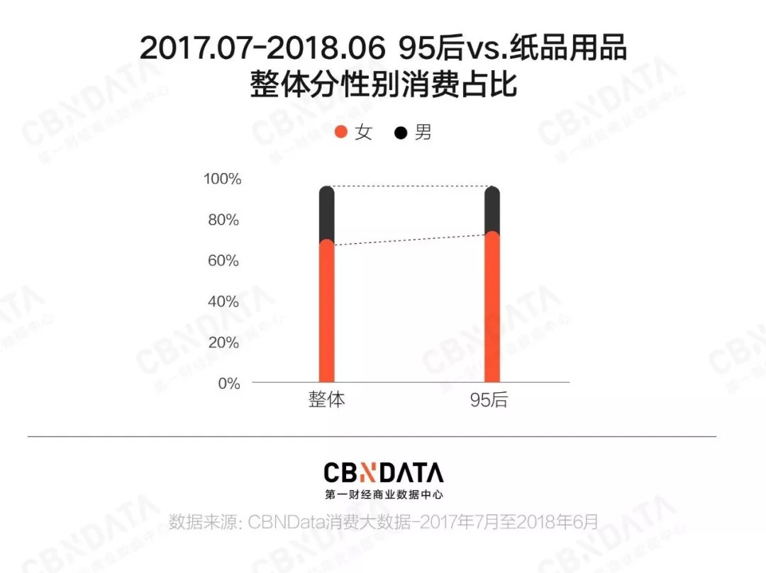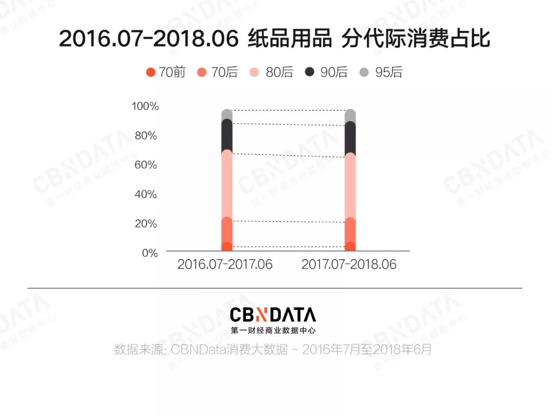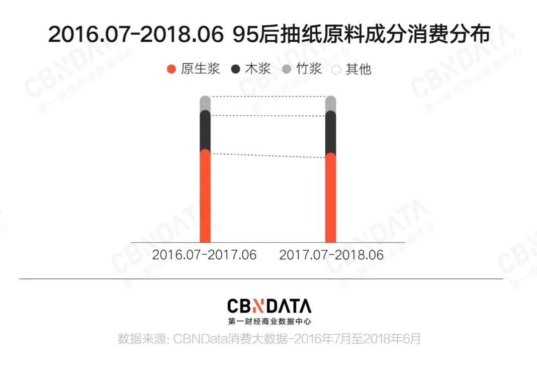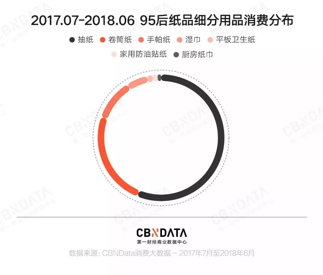 和卷纸相比,抽纸不仅使用方便,而且品质相对更高,从国家对于纸巾的质量标准来看,纸巾纸(抽纸/面巾纸)执行的微生物卫生标准和内裤相同,比卷纸的卫生标准更高,因此深得“十指不沾阳春水”的95后欢心。在2017年7月至2018年6月的滚动年间,95后抽纸的消费占比超过一半。