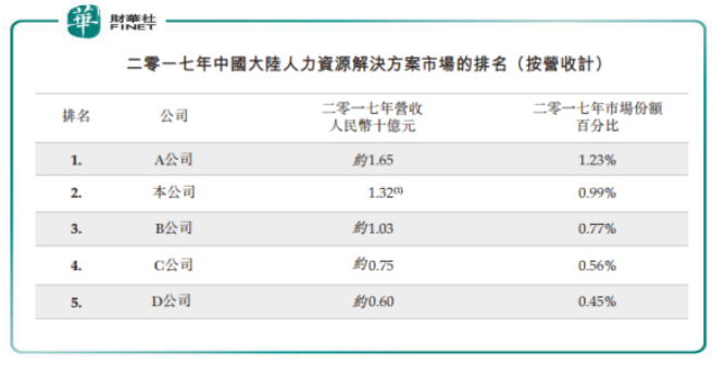 在2017年中国大陆人力资源解决方案市场排名(按营收计)中,万宝盛华排在第二名,不过仅有0.99%的市场份额。可见市场集中度非常低,竞争相当激烈。