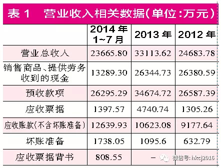 同期,朗脉股份合并现金流量表数据显示,这两年公司的“销售商品、提供劳务收到的现金”分别为26344.73万元和13289.3万元,对冲同期与现金收入相关的新增预收款项,即2013年、2014年前七个月公司新增预收款分别为8087.33万元、-8379.43万元的影响,则与这两年营收相关的现金流入了18257.4万元和21668.73万元。将这两年含税营收与现金流数据勾稽,则含税营收比收到的现金分别多出20485.54万元和6020.26万元。理论上,这些差额应该体现为债权的新增,即应收款项应分别增加20485.54万元和6020.26万元。