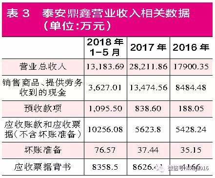 从当初的并购方案来看,泰安鼎鑫2017年、2018年前五个月的营业收入分别达到了28211.86万元和13183.69万元(见表3),考虑到国内营收增值税(17%税率)因素的影响,其含税营收分别为33007.88万元和15424.92万元。