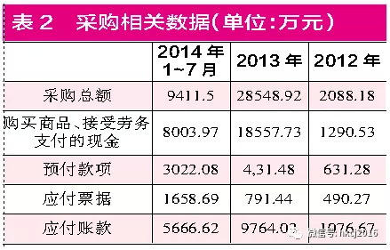 除了营收方面数据有异常外,《红周刊》记者还发现朗脉股份2013年、2014年前七个月的采购方面数据同样存在较大金额异常。
