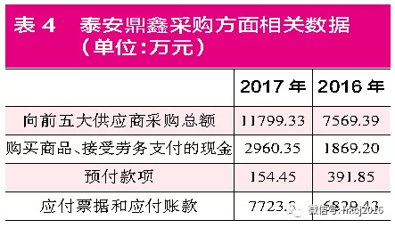 除了营收方面数据出现异常外,《红周刊》记者发现泰安鼎鑫2017年的采购方面数据同样是存在较大金额的异常的。