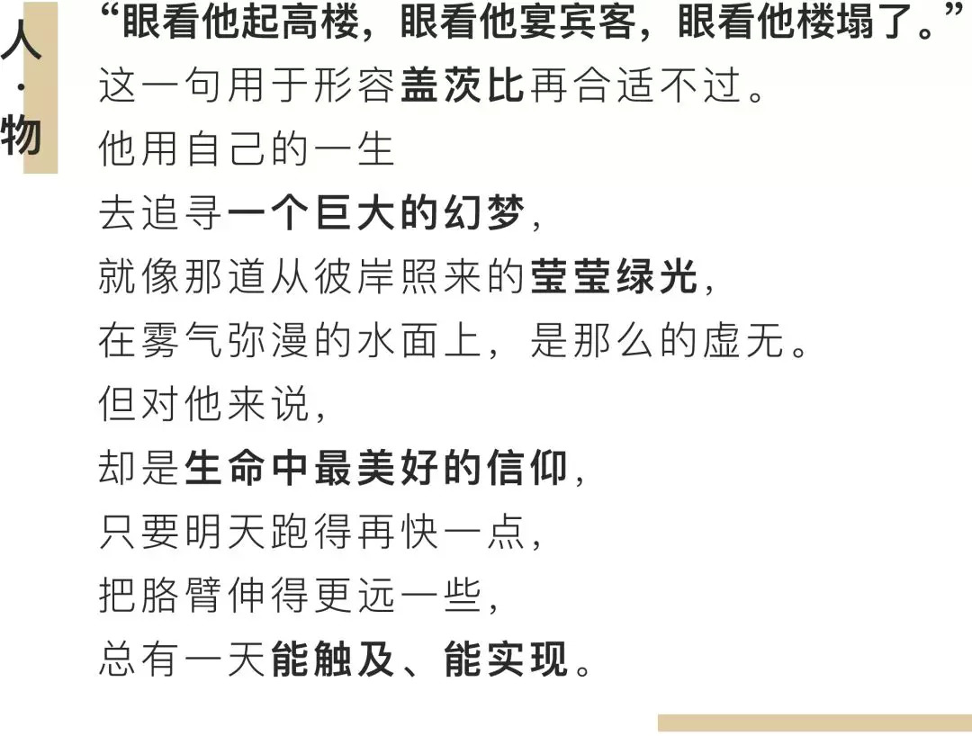 然而让这个世界闪闪发亮的,让我们澎湃于胸激情难平的,从来不是蓝血贵族,也不是盛世美颜,而是盖茨比这样的梦想家,是他那一颗从不言弃的赤子之心。那道在漆黑的夜里从彼岸照来的莹莹绿光,凡庸的我们觉得虚无,对他来说却是生命中最美好的信仰,他相信,只要明天跑得再快一点,把胳臂伸得更远一些,总有一天能触及、能实现。