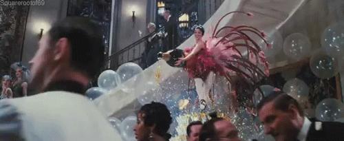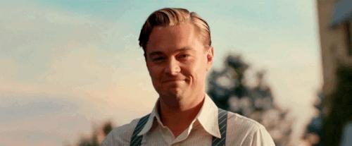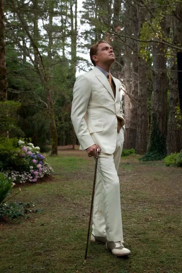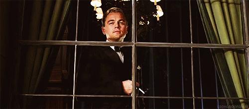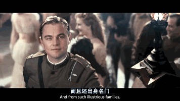 他在黑暗中转身,脚下是上流社会的笙歌喧腾,身后升起点亮夜空的绚烂烟火,他举起手中的浅碟香槟杯,露出颠倒众生的微笑。这一幕堪称是小李子影史上最盛大的出场了,也绝对是《了不起的盖茨比》中最经典的画面。