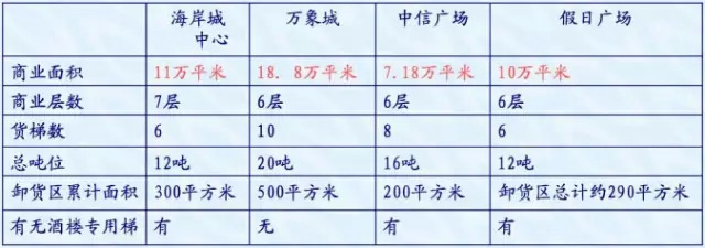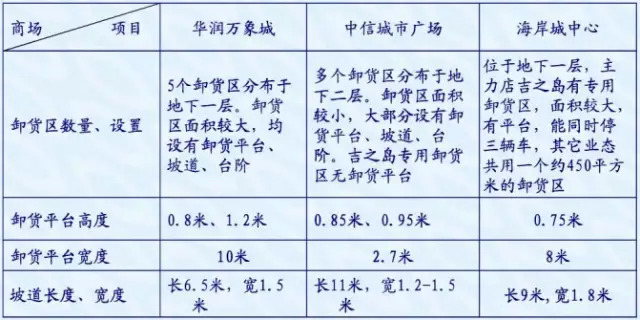 深圳万象城等高端购物中心采取封闭分散卸货模式,在地下一层设置卸货平台进行一次卸货,在地上三层设置货梯进行二次卸货。