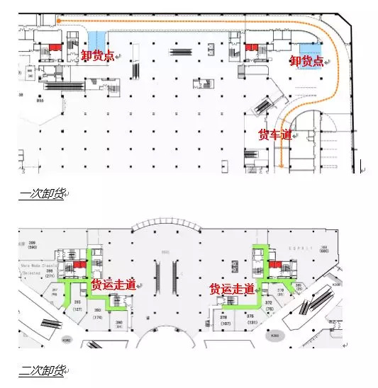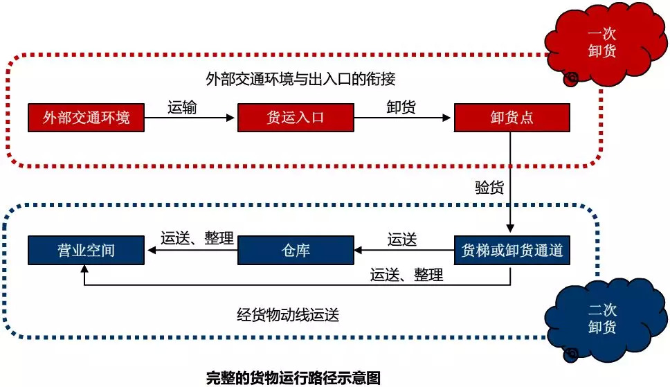 购物中心卸货动线一般分为一次卸货与二次卸货,其中一次卸货可能与机动车流线冲突,二次卸货可能与消费人行流线冲突。
