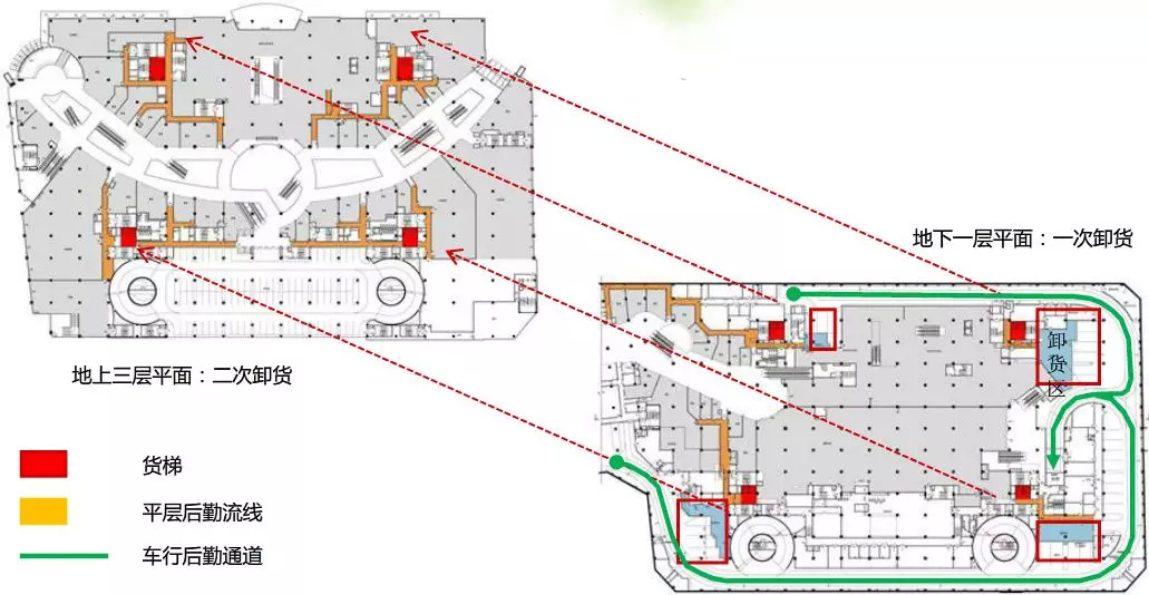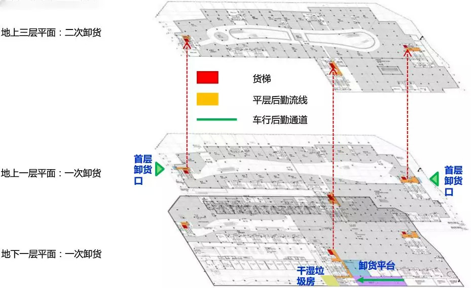 北京金隅万科广场采取混杂分散卸货模式,地上一层与地下一层进行一次卸货,地上三层进行二次卸货。