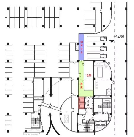 ③供大货车使用的收货区及卸货平台可集中设计一处,供散户小型货车应结合货梯位置分散设计;