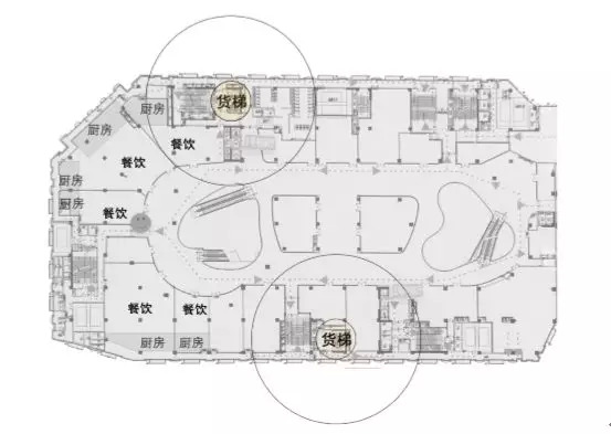 (注:餐饮区货梯附近考虑垃圾房的设置,一般垃圾房设置在主车道上,离车道出口较近,尽量靠近货梯设置。考虑垃圾房的通风性和美观性,避免产生异味)