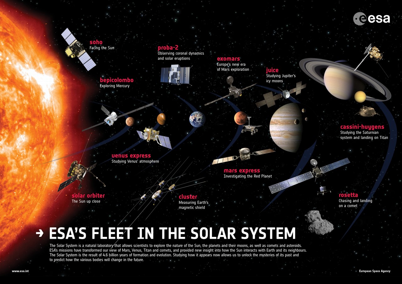 自1975年成立以来,欧空局探测器的足迹已经遍布了整个内太阳系。1990年,与NASA合作的太阳探测器尤利西斯号(Ulysses)升空,并于接下来的19年间为人类研究太阳风和太阳磁场提供了大量数据;1997年发射的泰坦星(土卫六)探测器惠更斯号(Huygens)更是于2005年登陆泰坦星,成为首个在外太阳系天体登陆的探测器;2005年发射的金星快车号则在其服役的9年时间内研究了浓密的金星大气,并为解决地球未来温室效应提供了大量的参考数据;2004年欧空局发射的彗星探测器罗塞塔号(Rosetta)于2014年登陆67P/楚留莫夫-格拉希门克彗星,为太阳系起源和彗星活动做出了重大贡献;欧洲人的火星计划也同样历史悠久:2003年发射的火星快车号运行超过15年,并确定了火星两极存在水冰,2016年发射的火星微量气体任务卫星(TGO)以及将持续到2022年的火星探测计划(ExoMars)更是欧洲人在航天领域深厚技术实力的体现。
