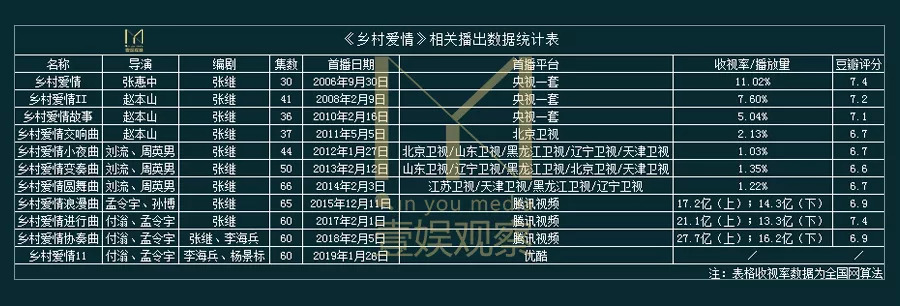 12年10部,共489集(不含《乡村爱情11》),唯一能够与之相媲美的,也只有从2004年拍到2014年,共10部267集的《杨光的快乐生活》系列。不过,自《乡村爱情11》2019年正式上线播出,这个系列已经荣膺中国内地“最长寿”系列剧集的称号。