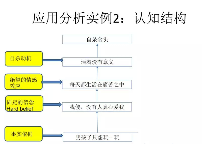根据“男孩子只想玩一玩”为事实依据,她会得出“我傻,没有人真心爱我”的固定信念,并产生“每天都生活在痛苦之中”的绝望情感效应,并产生“活着没有意义”的自杀动机。