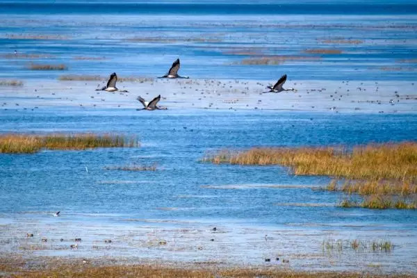这里,游人很少,天也很蓝, 你可以在岸边发呆,也可以骑着自行车环湖而行,也可以坐船游荡在水道之间,静听风声水声的美好。