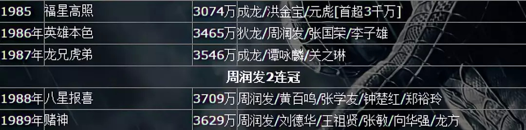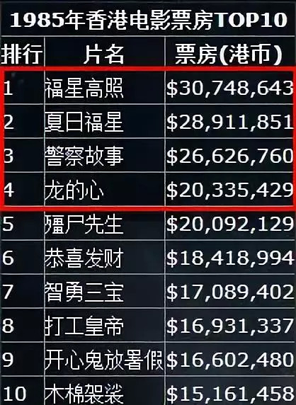 1985年,被许冠杰压制多年的成龙迎来大爆发,年度票房前4都被他的作品包揽。