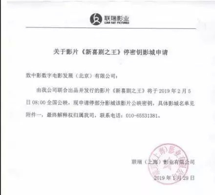 昨天下午,负责发行《新喜剧之王》联瑞影业发布声明: