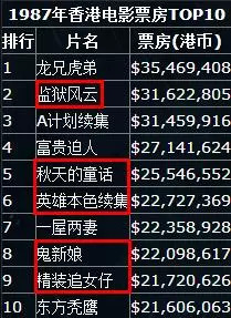 1987年周润发拍了11部电影,有5部进入年度票房榜前十。