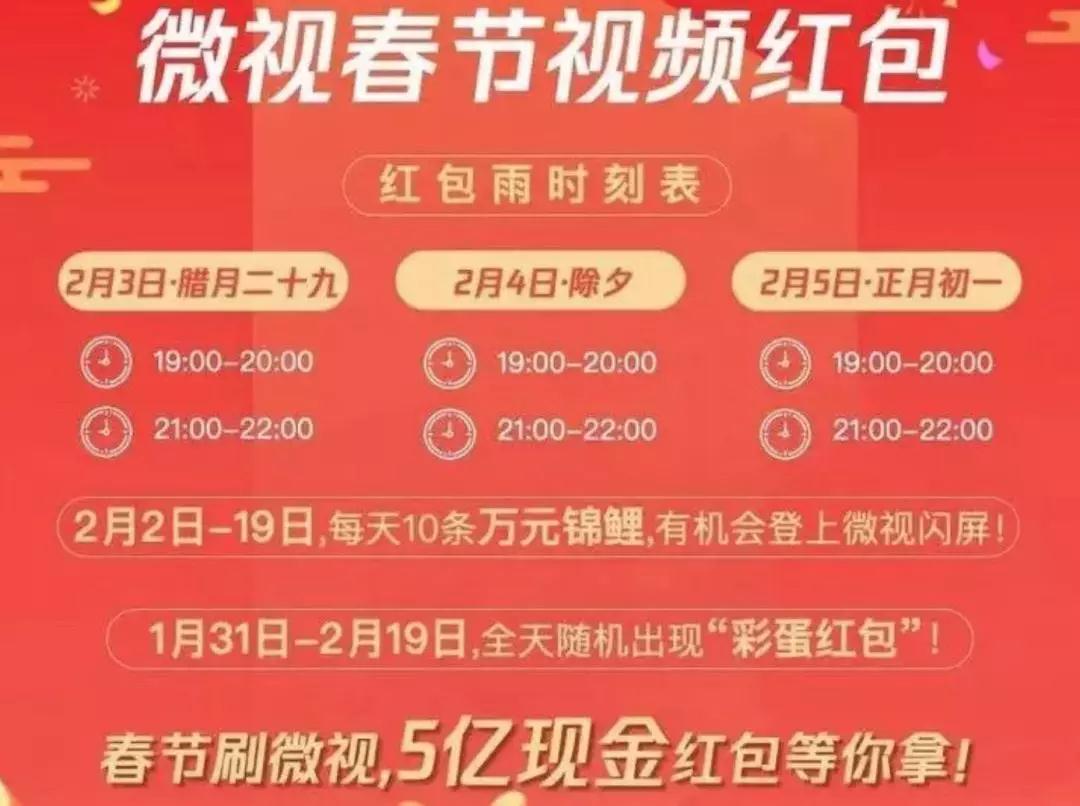 此外,春节2月3日(腊月二十九)、2月4日(除夕)和2月5日(正月初一)三天期间推出视频红包雨,发放5亿现金红包。