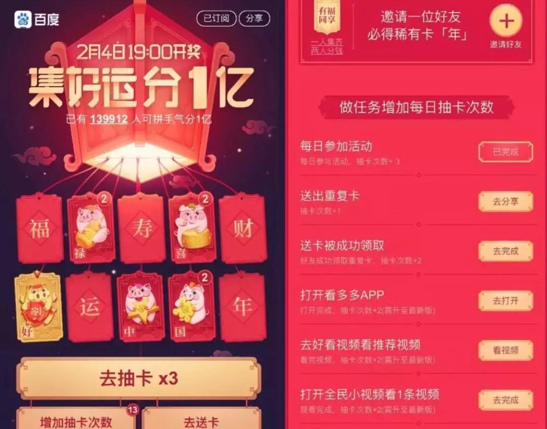 除了9亿在春晚发放,其余1亿百度已经陆续正在发放,主要形式为集卡与团圆红包。