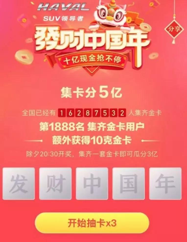 领取见面礼红包之后,用户还能通过集卡和红包雨的方式共分10亿红包。用户的集卡阶段分为集金卡和集钻卡,分别需要集齐“发财中国年”和“家和万事兴”字样。集齐金卡的用户将平分3亿红包,集齐钻卡的用户将平分2亿红包,红包将于除夕夜(2月4日)20点30分准时开奖。
