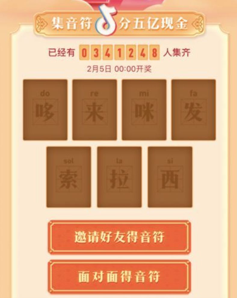 抖音用户可以通过邀请好友得音符、面对面得音符、完成“特殊任务”如下载今日头条急速版、关联通讯录等方式获得随机音符。凡是集齐“哆、来、咪、发、索、拉、西”七音符的用户皆可参与瓜分5亿红包,开奖时间为2月4日(除夕)晚24点,最高可获2019元的大奖。