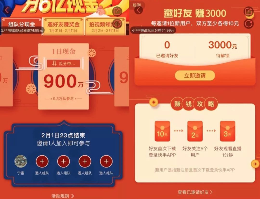 快手在今年的红包活动上,结合了AI黑科技,也添加和抖音一样的组队等社交元素。