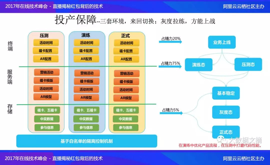 蚂蚁金服在终端上采用了限流无感知、资源预下载、用户操作数据缓存、开奖时间离散、数据项与开关动态配置等稳定性操作;在服务端,进行了全链路梳理、全链路压测、限流保护、应急熔断机制等。