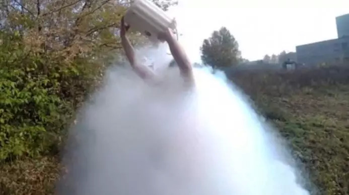 在众多的实验中,最疯狂还数它。2014年,旨在关注渐冻人症的“冰桶挑战”活动风靡全球。在液氮化工厂工作的俄国小伙Anton Konovalov也进行了一次“冰桶挑战”,不过他用的不是冰水而是液氮。