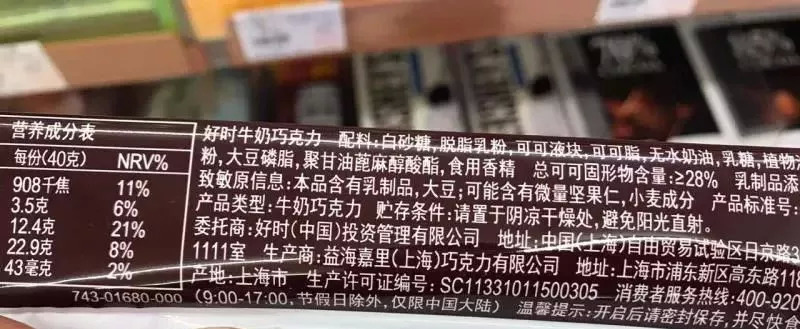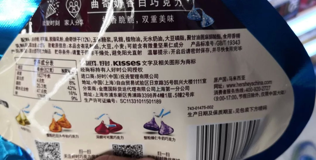 此外,好时“曲奇奶香白巧克力”(82g)等部分产品在包装上则显示原产国为马来西亚,分装商为金鹰国际货运代理有限公司上海第一分公司。