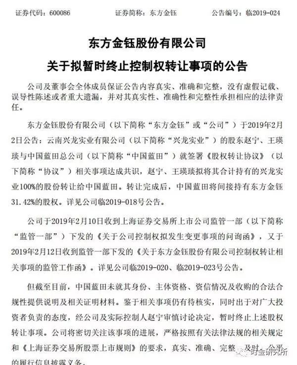 2月12日晚间,东方金钰发布公告称,中国蓝田未就其身份、主体资格、资信情况及收购的合法合规性提供说明及相关证明材料。鉴于相关事项仍有待核实,同时出于对广大投资者负责的态度,经公司及实际控制人赵宁审慎讨论决定,暂时终止上述股权转让事项。