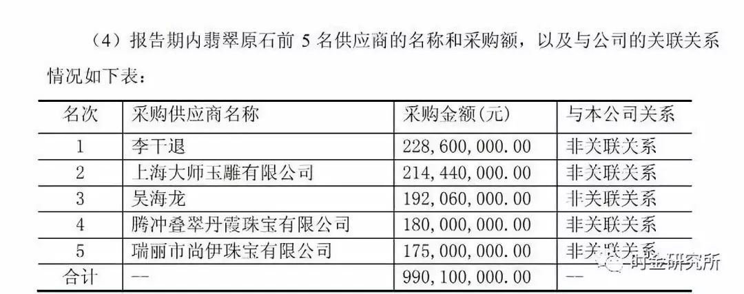 腾冲叠翠丹霞珠宝有限公司和瑞丽市尚伊珠宝有限公司分别是东方金钰2017年度第四大和第五大翡翠原石供应商,双方发生年度采购金额合计高达3.55亿元。