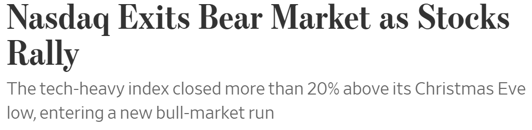 【纳指迎来八连涨逐渐走出熊市】纳斯达克指数在本周迎来第八连涨,终于把各大科技股从2018年末的熊市中挽救出来。大部分科技公司的第四季度报告已经发布,并取得了比预期更好的成绩,让纳指收市数据比圣诞夜的惨淡高出20%。周五纳指收涨45.46点至7472.41,涨幅0.6%;道指涨443.86至25883.25点,涨幅1.7%;标普涨29.87至2775.60点,涨幅1.1%。