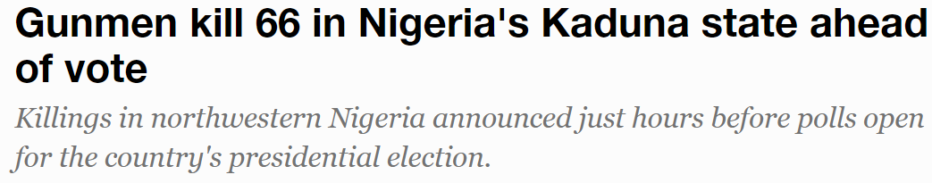 【尼日利亚大选在即 国家安全形势紧张】尼日利亚将在周六进行大选。当地时间周五,该国西北部卡杜纳州发生枪击案,枪手共击毙66人,其中包括22名儿童和12名女性。卡杜纳州是选举暴力高发区,专家称此案可能会影响选举结果。另据路透社报道,为了本次大选,政府出动了万余名安保人员和警力,但选举暴力仍未得到平息。本次选举中,现任总统布哈里将争取连任,他的对手是前副总统阿布巴卡,曾在1999-2007年担任公职,现为一名商人。