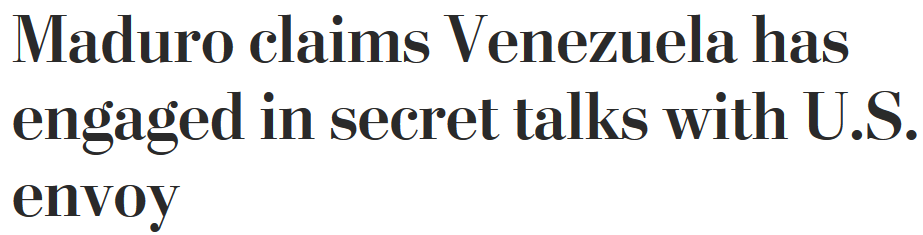【马杜罗爆出与美国特使秘密会谈】据美联社消息,委内瑞拉总统马杜罗称他的政府成员和特朗普派遣至委内瑞拉的特使Eliott Abrams进行了一次密谈,并邀请特朗普来委内瑞拉访问。委外长Jorge Arreaza在纽约与特朗普政府成员此前曾见面,并希望特朗普能够“公开地、非公开地、秘密地”访问委内瑞拉。马杜罗曾指责特朗普造成了委内瑞拉今天的危机。